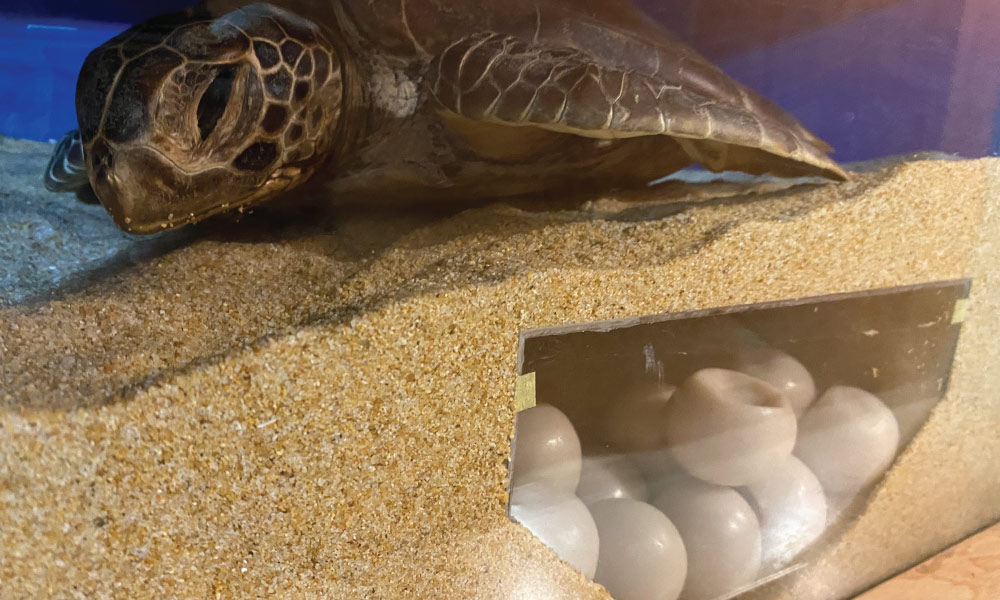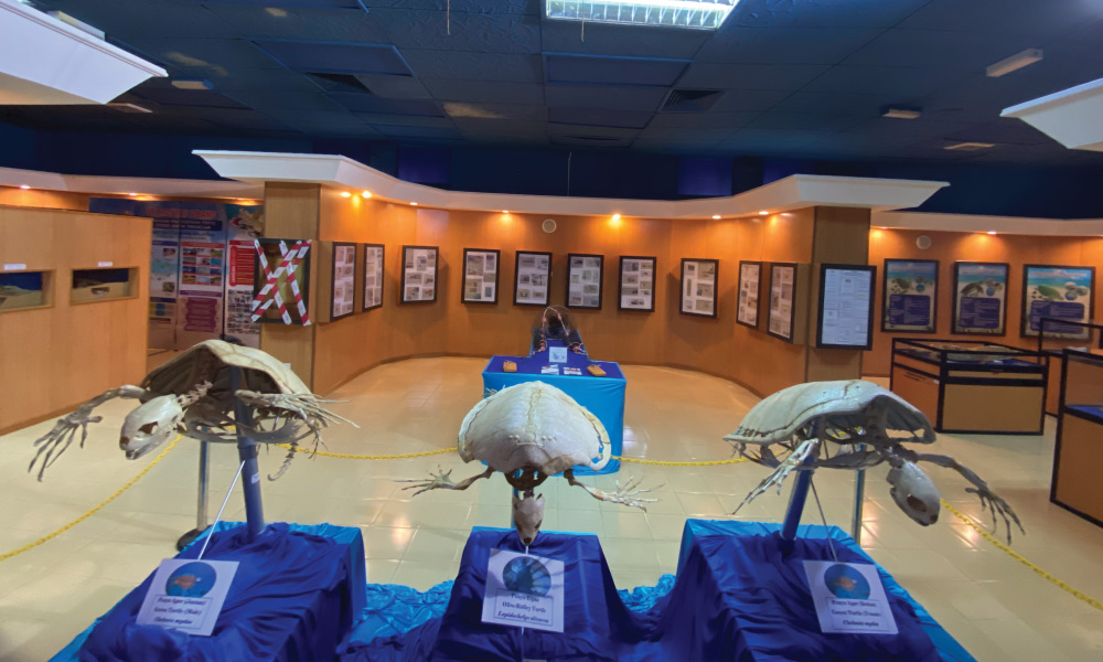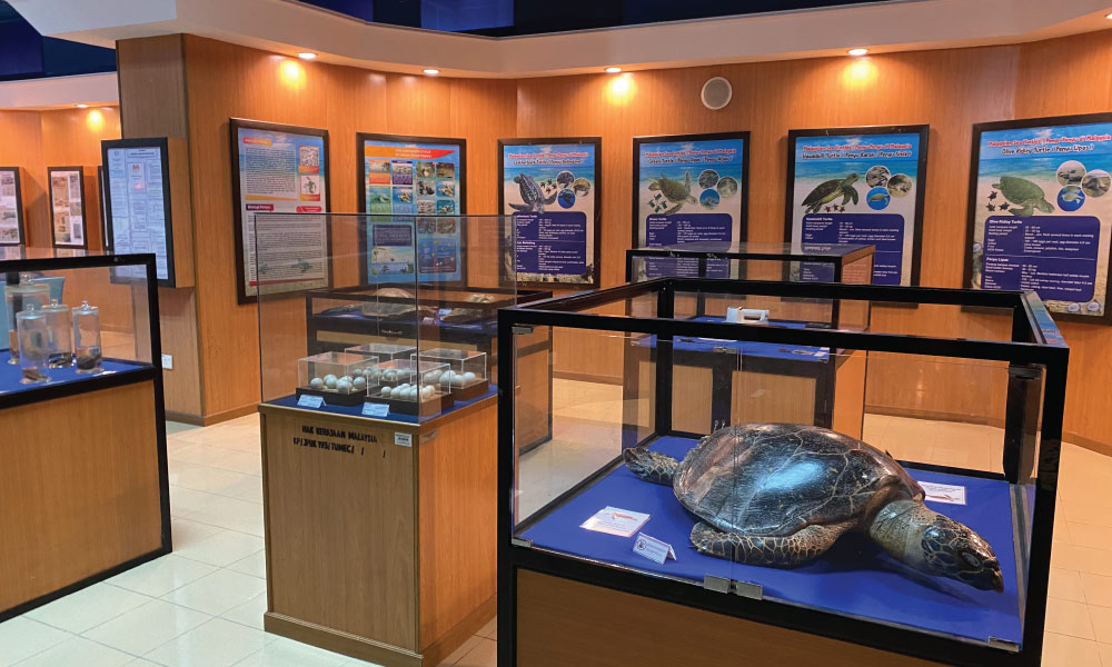 Manakala unit pameran penyu pula dilengkapi dengan rangka spesies Penyu Lipas (Lepidochelys olivacea) dan Penyu Agar (Chelonia mydas) selain awet kering spesimen penyu dan replika sarang penyu serta model Alat Pengisih Penyu/Turtle Excluder Device (TED). Sementara itu, bahagian ekosistem marin pula menempatkan spesimen awet kering spesies terumbu karang, kima gergasi dan kerang-kerangan di perairan Malaysia.